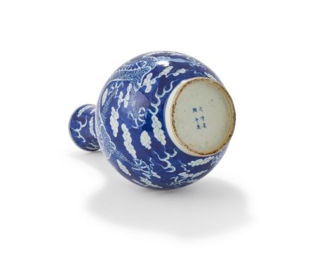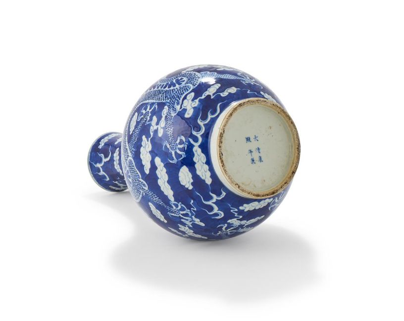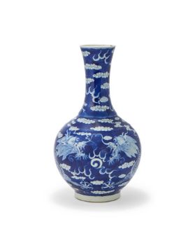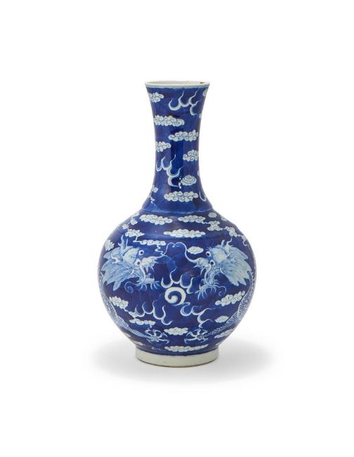 A Chinese blue and white 'dragon vase', Qing dynasty, 19th century, painted with two confronting dragons chasing a flaming pearl, the base with apocryphal six-character Kangxi mark in underglaze blue, 39cm high 晚清 青花龍趕珠紋瓶 Condition Report: Typical firing blemishes otherwise in good condition Condition Report Disclaimer