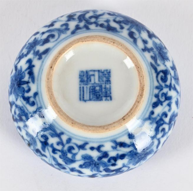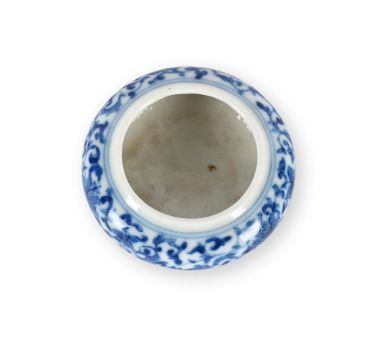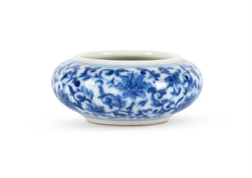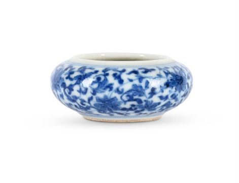 A rare small Chinese blue and white water pot, Yongzheng mark and of the Period, of compressed globular form set with a wide mouth, the rounded sides finely painted with composite floral scrolls, the base with underglaze blue six-character seal mark, 5.5cm diameter x 2.3 cm high Provenance:Property from a private Buckinghamshire collection. 清雍正 青花纏枝蓮紋小水呈「大清雍正年製」款拍品來源:英國白金漢郡私人收藏 Condition Report: some fine hair cracks to the rim mainly in the glaze Condition Report Disclaimer