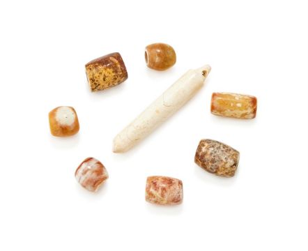 A group of assorted Chinese jade beads, Liangzhu culture, circa 3000 BC, including a calcified jade cylindrical jade bead, 5.2cm longProvenance: Private collection in HampshirePlease note this lot is to be sold without reserve. 新石器時期良渚類型 玉管一組*請注意本品不設底價拍品來源:漢普郡私人收藏 Condition Report: wear to the surface and stone with natural flawslong jade bead on one side with the surface flaked offCondition Report Disclaimer