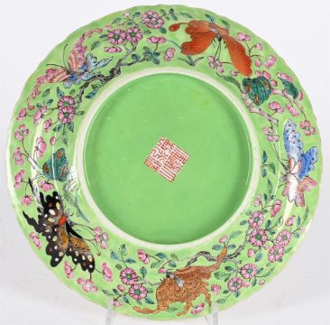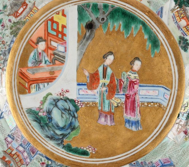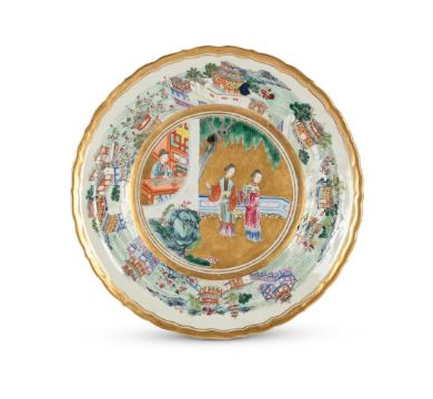 A Chinese Famille Rose 'Romance of the Western Chamber' plate, mark of Daoguang and of the period, the interior finely enamelled with the lady Cui Yingying and her maid standing in a fenced garden, listening to the scholar Zheng Sheng playing the qin, the base inscribed with a six-character daoguang mark in iron red, 20cm diameterCompare a similar plate sold at Christie's Paris, July 12, 2022, Lot 685清道光 粉彩描金西廂記人物故事圖葵口盤「大清道光年製」款 Condition Report: wear to the enamel and the rim with some retouch to the gildingCondition Report Disclaimer