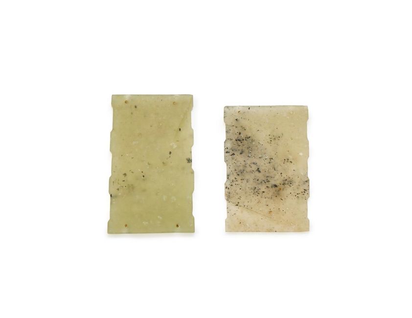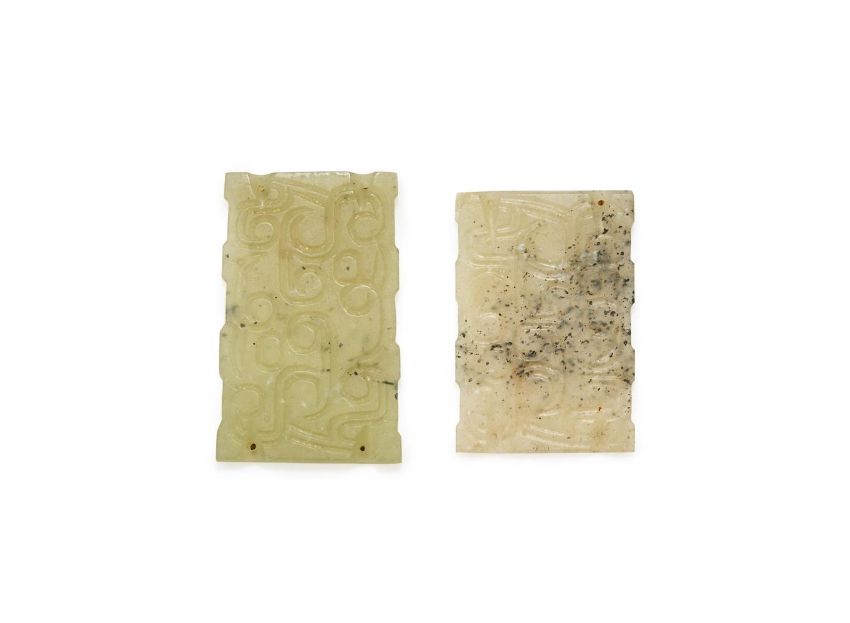 Two rectangular jade plaques from jade suit, Western Zhou (1046-771 BC), both carved with scrolling design, 3.5cm x 2.2cm (2)Provenance: Private collection in HampshirePlease note this lot is to be sold without reserve. 西周 勾雲紋玉片拍品來源:漢普郡私人收藏*請注意本品不設底價 Condition Report: jade with natural inclusionsCondition Report Disclaimer