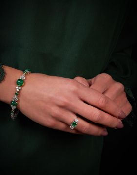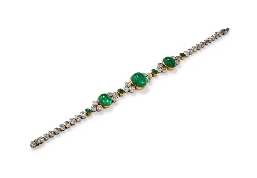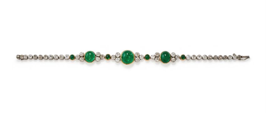 AN EARLY 20TH CENTURY EMERALD AND DIAMOND BRACELET CIRCA 1915-20 Composed of three cabochon emeralds between old European cut diamond three stone clusters, with smaller cabochon emerald connectors, to an old European cut diamond line back, French poinçons, rubbed maker's mark Size/dimensions: 18.0cm long Gross weight: 24.0 gramsProvenance: Given by Irene Rothschild Guggenheim to her daughter Eleanor May upon her marriage to Arthur Stuart, 7th Earl Castle Stuart in 1920 Thence by descent Condition Report: Diamonds approximately 0.10-0.20ct each, approx. 5.50cts total, average estimated clarity I1. Largest emerald measuring approx. 11.40 x 10.50 x 6.80mm, calculated weight approx. 6.0ct. Of a bright slightly bluish green hue with typical natural inclusions are eye visible and surface reaching. Safety chain is currently detached on one side. Nicks and scratches and general signs of wear.Condition Report Disclaimer
