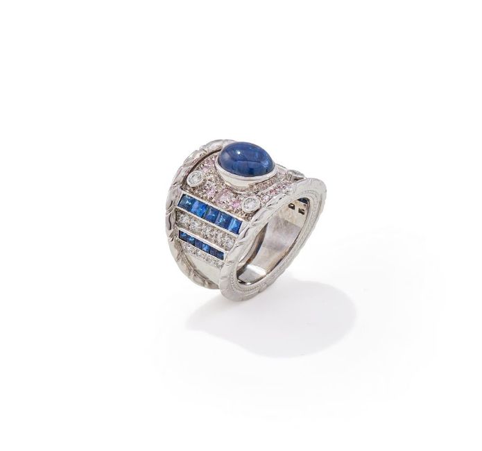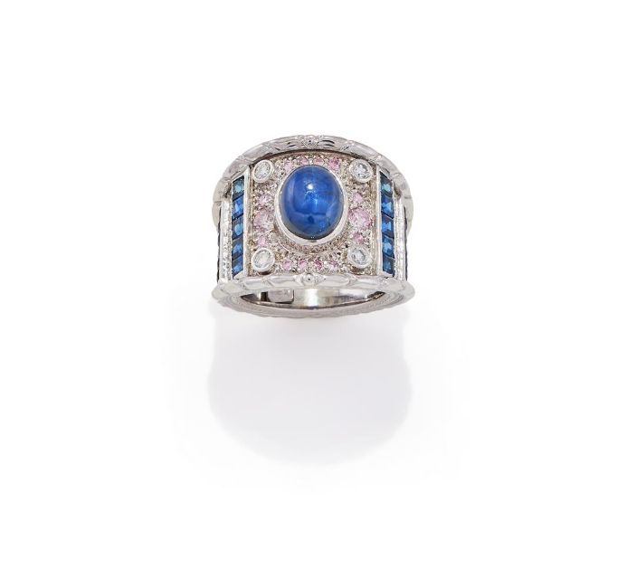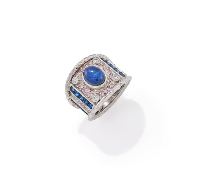 A STAR SAPPHIRE AND GEM SET DRESS RING The cabochon star sapphire collet set within a brilliant cut pink diamond surround with diamond corners, to alternating calibré cut sapphire and brilliant cut diamond line shoulders, mounted in 18ct white gold, UK hallmark Size/dimensions: ring size N Gross weight: 19.6 gramsPink diamonds untested and unwarranted for natural colour
