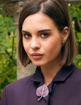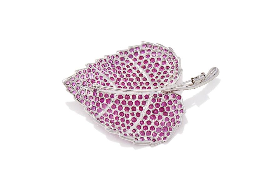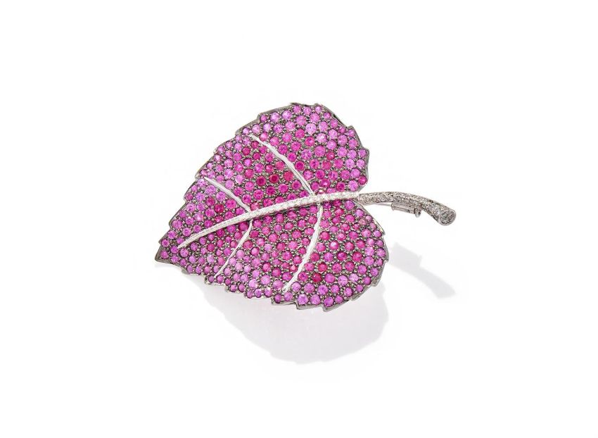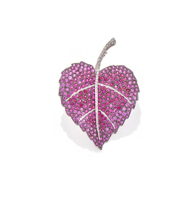 A DIAMOND, RUBY AND PINK SAPPHIRE LEAF BROOCH The tapering leaf pavé set with graduated rubies and pink sapphires, with brilliant cut diamond set vein and stalk, stamped 18K 750 Size/dimensions: 6.6cm long Gross weight: 20.3 grams  Condition Report: The brooch has minimal signs of wear, the stones are all present and correct, bright, diamonds livelyCondition Report Disclaimer
