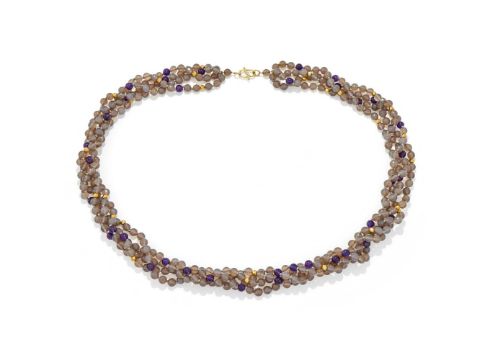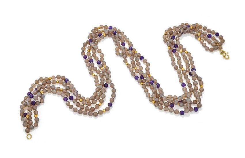AN AGATE AND AMETHYST BEAD NECKLACE Composed of four rows of facetted agate beads, interspersed with polished amethyst beads and facetted connectors, to an S-shaped clasp, unmarked Size/dimensions: 100.0cm long Gross weight: 300.0 gramsProvenance: From the family of Syrie Maugham Condition Report: Clasp is unmarked and remains untested. Gold coloured beads appear plated, with core visible underneath. Grey agate fairly well matched, some cloudier than others. Amethysts of a deep purple hue and well matched. some typical natural inclusions visible under closer inspection. Overall in good condition with normal signs of wear.Condition Report Disclaimer
