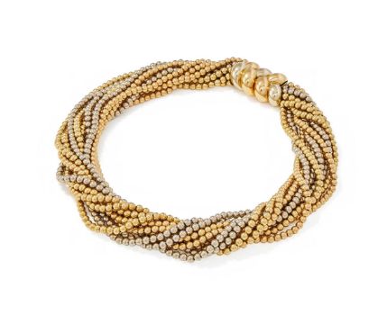 POIRAY, A BEAD TORSADE NECKLACE Composed of multiple tri-coloured rows of beads, to a plaited clasp Size/dimensions: 41.5cm long Gross weight: 189.2 gramsProvenance: From the family of Syrie Maugham Condition Report: There are three partial marks on one of the yellow tone beads. One bead of each colour has been surface tested in the office as higher carat gold, however this cannot be guaranteed. Some nicks, dents and scratches throughout and some discolouration to a few beads near the clasp. Clasp closes securelyCondition Report Disclaimer