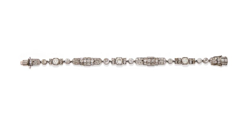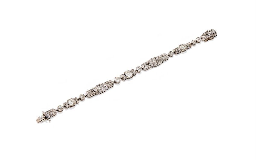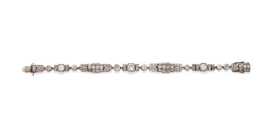 AN ART DECO DIAMOND BRACELET CIRCA 1925 Composed of alternating geometric links set throughout with old European cut diamonds with diamond single stone spacers between, diamonds approximately 8.50-9.00 carats total Size/dimensions: 18.7cm long Gross weight: 21.9 grams Condition Report: The diamonds are all present and correct, bright and lively, colour mostly I-K, clarity varying, but mostly SI-I. There is some surface wear to the settings commensurate with age and use, some possible replacements to the connecting loops, the tongue and one of the safety catches appear to be replacements, the clasp in working order when the safety catches are applied, the tongue catch is not currently secure on its own, it will benefit from a slight adjustment. Condition Report Disclaimer