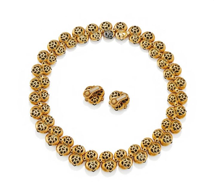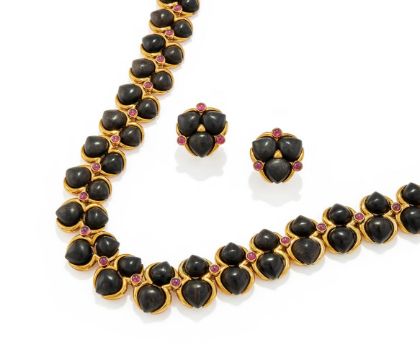 Y RENÉ BOIVIN, AN EBONY AND RUBY NECKLACE AND EARRINGS The necklace composed of opposing bombé pear shaped ebony motif links with collet set cabochon ruby connectors, the earrings of similarly set trefoil design, necklace signed René Boivin, earrings signed R. Boivin, earrings with maker's mark, each with French poinçon Size/dimensions: necklace 44.5cm, earrings 2.2cm long Gross weight: 195.9 grams Provenance: From the family of Syrie MaughamPlease be aware that this lot contains material which may be subject to import/export restrictions, due to CITES or Fish & Wildlife regulations. Please note it is the buyer's sole responsibility to obtain any relevant export or import licence. René BoivinBorn in 1864, René Boivin began his career at 17 as an apprentice goldsmith; by 1890, he had distinguished himself sufficiently as a designer and engraver to found his own workshop.Three years later, he married Jeanne Poiret, sister of the renowned couturier Paul Poiret. The marriage introduced him to Parisian high society, and in 1905 he stopped designing for companies such as Mellerio and Boucheron to focus on private clients.When René died, aged just 53, in 1917, Jeanne assumed control of the business. In an era when the jewellery industry was entirely male-dominated, she became the first woman to lead a prestigious Maison, transforming it into a female-run enterprise with a distinct, innovative aesthetic.Jeanne, sister to famed couturier Paul Poiret, infused Boivin's creations with fashion sensibility and modern femininity, rejecting ostentatious jewels prized only for their material worth. In collaboration with Suzanne Belperron, she developed a sculptural, sensual style that softened the rigid geometry of Art Deco, producing 20th-century icons such as the bombé ring, the 'barbaric' bangle, and the 'melon-slice' cuff. They favoured artistic over precious materials and drew on cultural motifs from Egyptian, Assyrian, and Merovingian art.When Belperron departed in 1932, Juliette Moutard succeeded her, deepening Boivin's nature-inspired designs-particularly seashells, flora, and animals. Her most celebrated creation was the monumental Starfish brooch (1937), famously worn by Claudette Colbert and Millicent Rogers.In 1938, Jeanne's daughter Germaine Boivin joined the Maison, adding couture-inspired motifs such as ribbons and embroidery. The postwar years produced further classics, including the Quatre Corps and Pampilles rings. Cultural influences persisted, with Hindu-inspired jewels echoing traditional Indian craftsmanship.Jeanne retired in 1954 and passed away in 1959. Moutard retired in 1970, and Germaine led the company until its sale in 1976. Maison Boivin ultimately closed in the early 1990s, leaving behind a legacy of daring design and female creativity. Condition Report: The discolouration to reverse visible in online photograph has been removed. Small spots of tarnish in places. Glue residue around wood. Ebony well matched. Rubies bright stones and well matched. Some surface scratches and nicks, one deeper scuff near clasp. Clasp closes securely. Clip fittings with good tension. Overall in good condition with normal signs of wear.Condition Report Disclaimer
