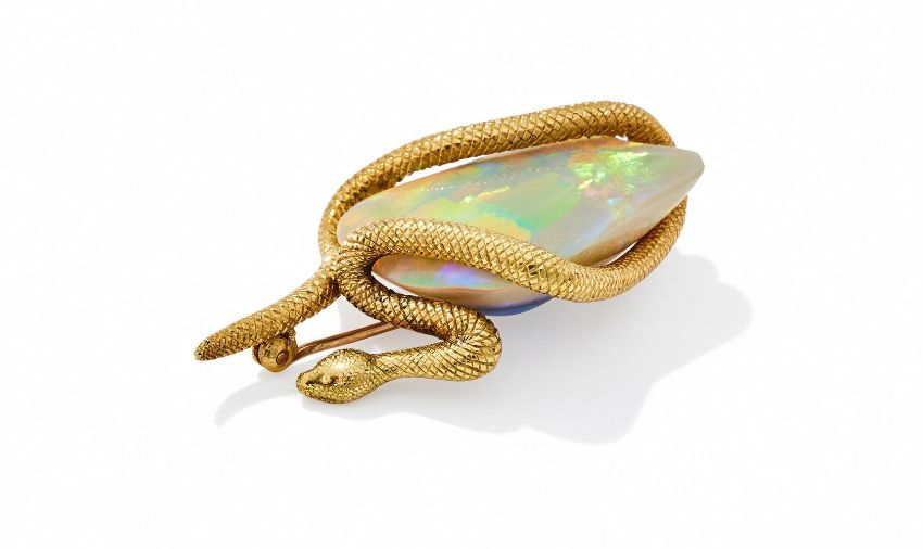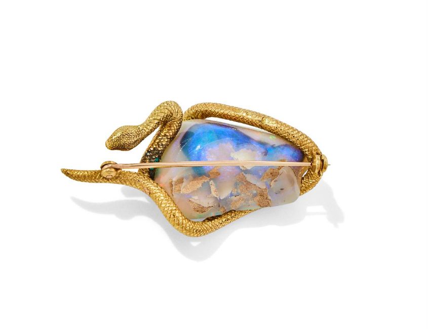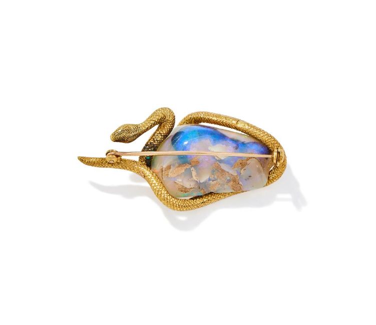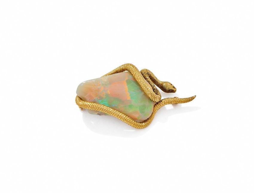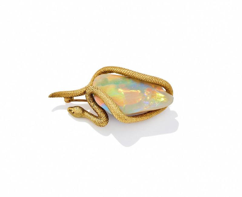 DAVID THOMAS, AN OPAL SNAKE BROOCH LONDON 1971 The freeform polished opal encircled by an 18ct gold snake, maker's mark, London hallmark Size/dimensions: 5.0cm long Gross weight: 20.6 grams Condition Report: The setting has some light wear, the hallmark clear, the opal has a white body colour with bright panels of colour, displaying red, yellow, green and some blue. Some light crazes but no major cracks, there is a couple of small chips to the opal which appear to have been in situ before set. Condition Report Disclaimer