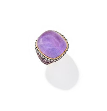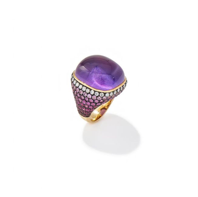 AN AMETHYST, DIAMOND AND PINK SAPPHIRE DRESS RING The cushion shaped cabochon amethyst to a pavé set brilliant cut diamond and graduating pink tone circular cut sapphire setting, stamped 750 with indistinct maker's mark Size/dimensions: ring size N Gross weight: 21.9 grams