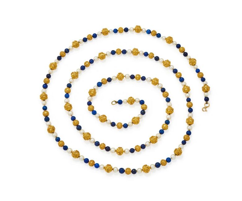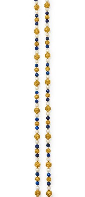 A CULTURED PEARL AND LAPIS LAZULI LONGCHAIN Composed of alternating lapis lazuli beads, cultured pearls and beads with ropetwist and beadwork decoration, unmarked Size/dimensions: 131.5cm long Gross weight: 98.5 grams