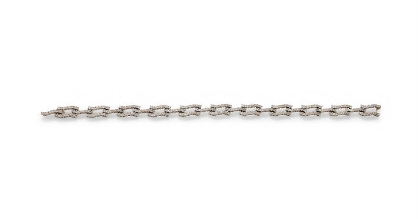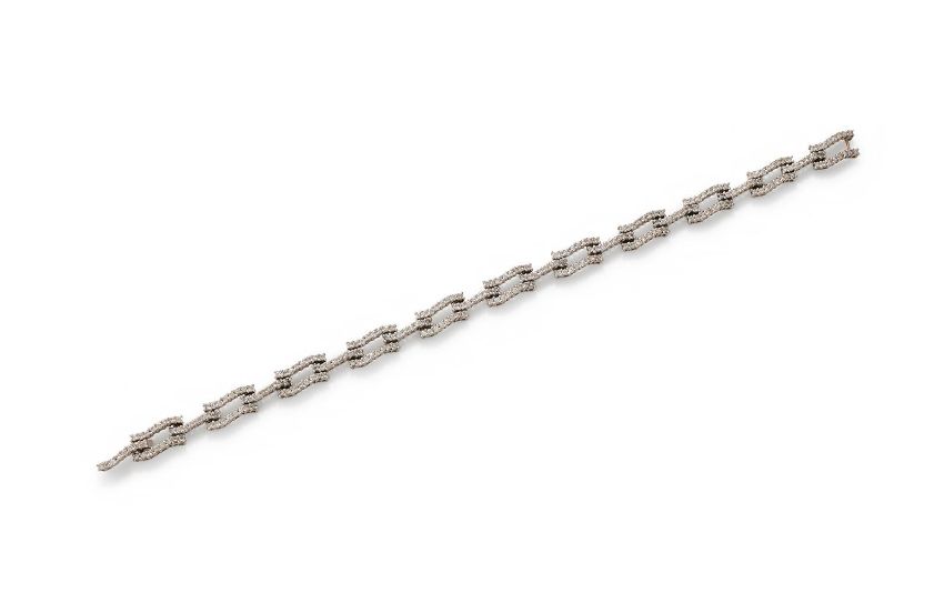 A DIAMOND BRACELET Composed of undulating twin and single links set with brilliant cut diamonds, diamonds approximately 3.20 carats total, stamped 750 Size/dimensions: 18.0cm long Gross weight: 11.3 grams Condition Report: Stamped 750, however no official hallmarks. Diamonds are bright and fairly well matched, of average commercial quality. Clasp closes securely. Normal signs of wear.Condition Report Disclaimer
