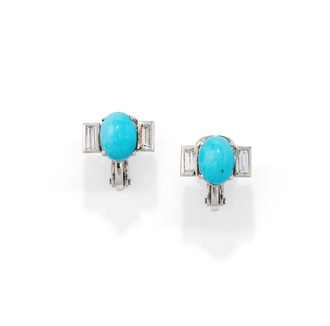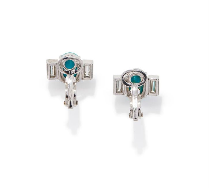 A PAIR OF TURQUOISE AND DIAMOND EARRINGS Each oval cabochon turquoise between baguette cut diamond shoulders, clip fittings, stamped 750 Size/dimensions: 1.5cm wide Gross weight: 7.9 grams