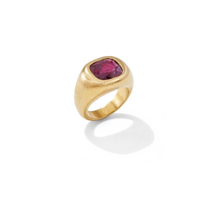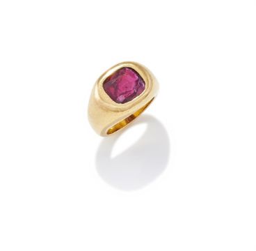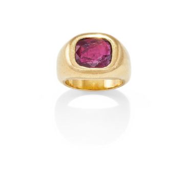 A RUBY SINGLE STONE RING The cushion shaped ruby in a tapered rubover setting, unmarked Size/dimensions: ring size I Gross weight: 18.8 grams Condition Report: The ruby has scratches and abrasion to the crown facets, there is a fracture to one corner of the stone and some nicks and nibbling along the fracture line, further fractures and feathers. The setting has some surface wear commensurate with use. Metal remains unmarked and untested.Condition Report Disclaimer