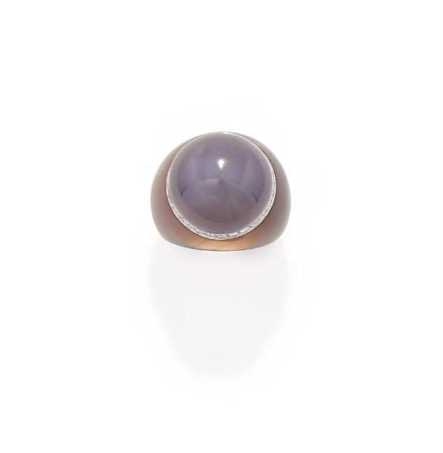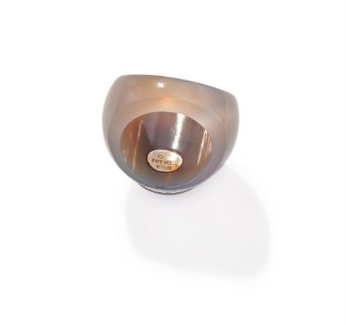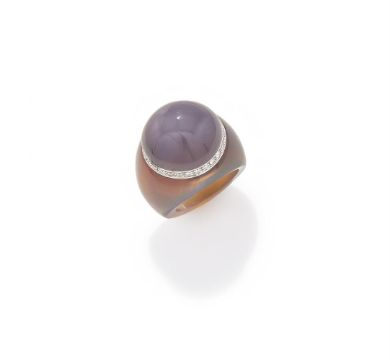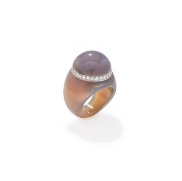CATHERINE PREVOST, A GREY AGATE AND DIAMOND DRESS RING The polished and shaped agate dress ring with a band of brilliant cut diamonds, stamped 750 with Italian control marks, signed Prevost Size/dimensions: ring size N 1/2 Gross weight: 18.0 grams Condition Report: approximately 0.56 carats total, Condition Report Disclaimer