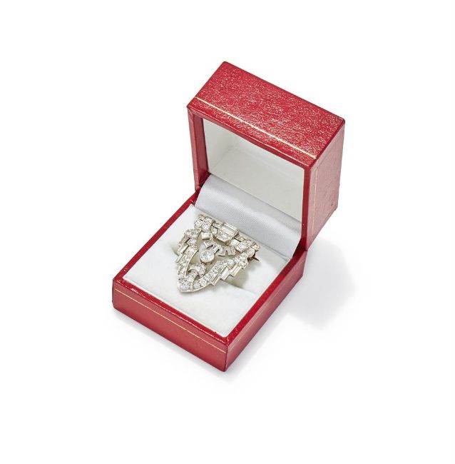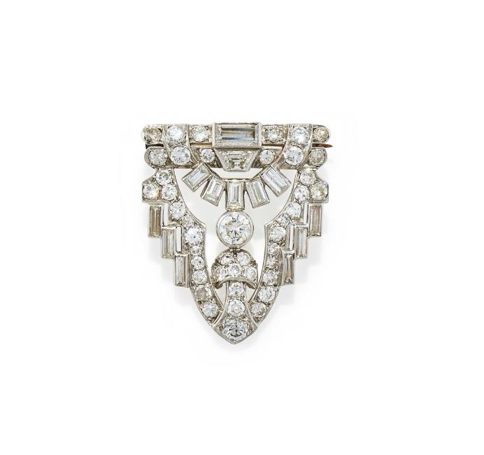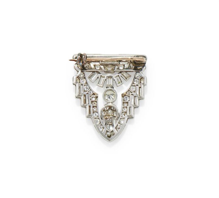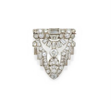 AN ART DECO DIAMOND BROOCH 1930S Of shield shaped openwork design, set throughout with old European, single and baguette cut diamonds, later pin fitting, unmarked Size/dimensions: 2.9cm long Gross weight: 7.3 grams Condition Report: All diamonds present and correct, approx. 2.20-2.40ct total, principal diamond approx. 0.20ct. Diamonds are bright stones and well matched. The later pin fitting has noticeable black solder at each base, pins to reverse have been filed down. Pin fitting appears secure. Some surface scratches and normal wear.Condition Report Disclaimer