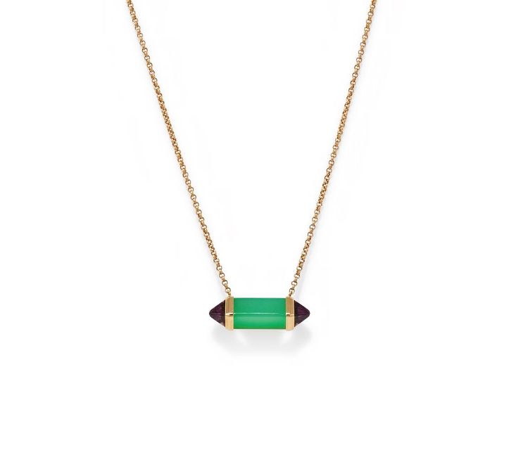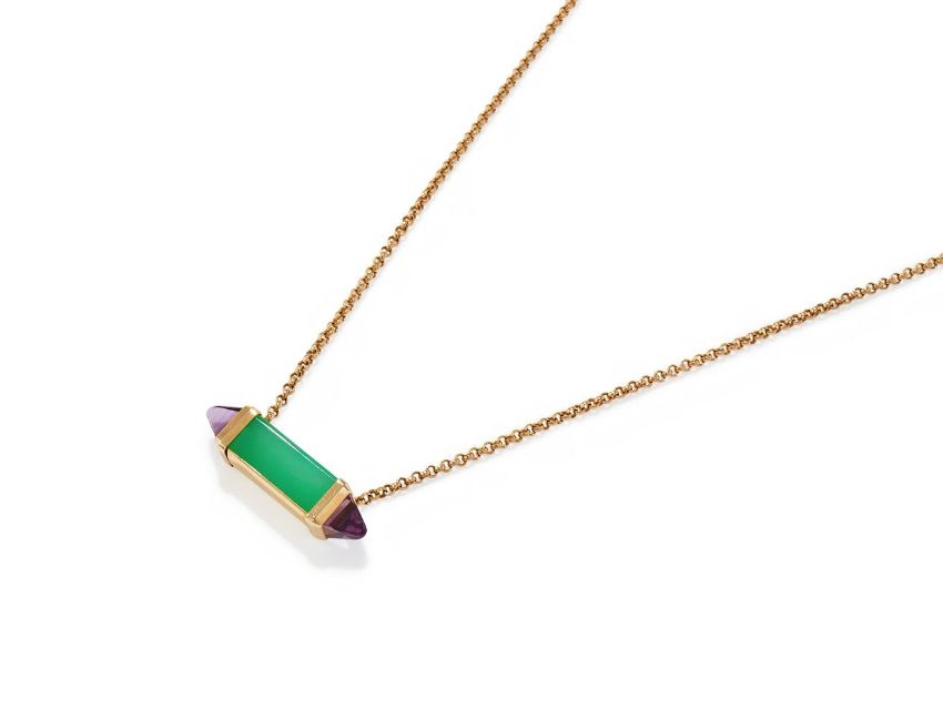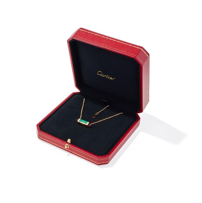 CARTIER, AN AMETHYST AND CHRYSOPRASE 'LES BERLINGOTS DE CARTIER' PENDANT The chrysoprase set baton with sugarloaf cabochon amethyst terminals, suspended from an 18ct rose gold trace link chain, signed Cartier, numbered PXT588, maker's mark, European convention mark, maker's case Size/dimensions: 41.5cm long Gross weight: 7.5 grams Condition Report: In very good overall condition with minimal signs of wear.In maker's red leather box, no papers.Condition Report Disclaimer