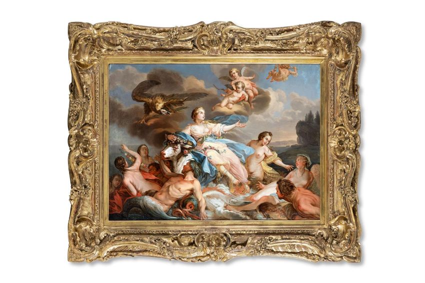 ‡ AFTER JEAN BAPTISTE MARIE PIERRE THE ABDUCTION OF EUROPA Oil on canvas 98.5 x 129.5cm (38¾ x 50 in.) Provenance: Anonymous sale; New York, Christie's, 7 April 1988, lot 114A (as Manner of Natoire). Anonymous sale; New York, Christie's, 24 October 2012, lot 28 (as after Jean-Baptiste Marie Pierre). Acquired from Jan's & Company Inc., Los Angeles by the present owner.  The present painting is a reduced copy, in reverse, of Jean-Baptiste Marie Pierre's monumental Abduction of Europa, (Dallas Museum of Art) which was nearly three metre wide and painted to decorate the salon of the artist's friend, celebrated amateur, collector and theoretician, Claude-Henri Watelet (1718-1786), who owned over twenty works by the artist. The original was exhibited in the Paris Salon of 1750 and engraved in 1762 by Louis-Simon Lempereur, which was probably the source of the present lot.