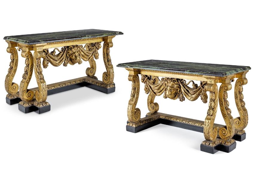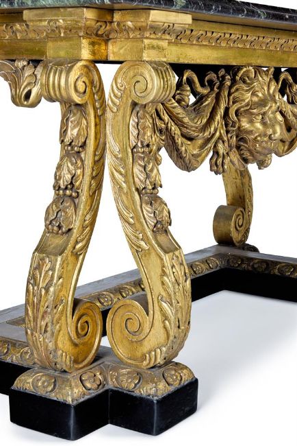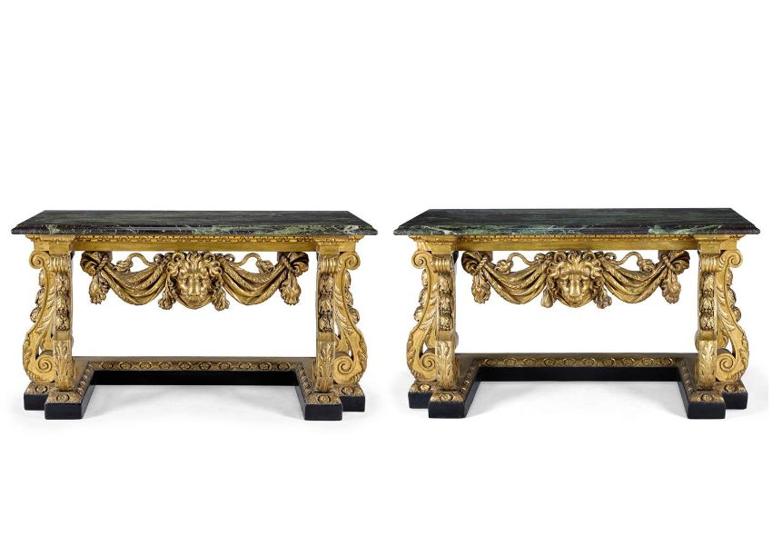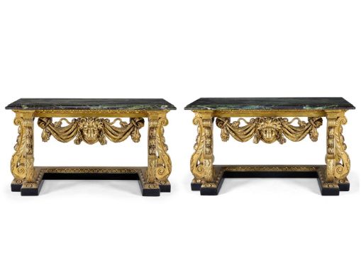 ‡ A PAIR OF GILTWOOD AND EBONISED SIDE TABLES POSSIBLY BY LENYGON AND MORANT, AFTER DESIGNS BY HENRY FLITCROFT AND MATTHIAS LOCK, LATE 19TH/EARLY 20TH CENTURY Each with a green variegated marble top above a leaf-tip carved frieze, with a bold pendant lion's head and draped pelt on foliate-carved S-scroll supports and a shaped plinth carved with rosettes, one with handwritten label `17229' 86cm high, 152cm wide, 61cm deepThe tables reflect the Palladian style promoted after 1719 by Lord Burlington and his disciples, most notably the architect designers William Kent (1685-1748) and Henry Flitcroft (1697-1769). Under their influence Palladianism became the de facto style for any significant public or private building and so too for furniture intended to complement the architecture. Kent's related designs include at table at Ditchley Park, c.1726, while another related pair of tables from Ditchley is now at Temple Newsam House, Leeds (LEEAGFU.154.00). Their design is attributed to Kent's assistant Henry Flitcroft who completed the interiors at Ditchley from 1736 - 41. A third table, almost identical to the Temple Newsam pair, now in the Metropolitan Museum of Art, New York (object no. 26.45), was sold by the Dukes of Hamilton in 1919 and was acquired by William Hesketh Lever, 1st Lord Leverhulme until sold after his death (Anderson Galleries, New York, 9 - 13 February lot 9). A design corresponding to the Temple Newsam and the Leverhulme tables is in the collection of the Victoria & Albert Museum, London (inv'. no, 2848.98). It came to the museum in an album of designs entitled Original Designs by Matts Lock, Carver 1740 - 1765, from a descendent of Lock. While Lock is perhaps most closely associated with the Rococo style, memoranda for carving work undertaken help to date his activities as early as 1742 - 44. In the early 20th century the London firm of cabinet-makers and decorators Lenygon & Morant became specialist manufacturers of 18th century style furniture some of which bears the brand 'made by Lenygon Co. Ltd Reproduction'. They were notably involved in refurbishing a number of houses where Kent had worked and employed the furniture historian Margaret Jourdain after 1911 as art correspondent, after which she assumed the pen-name Francis Lenygon. As Margaret Jourdain she wrote The Work of William Kent: Artist, Painter, Designer and Landscape Gardener (1948) that included related table designs. The tables offered here follow the eighteenth century designs, displaying a variety of typically `Kentian' features. Both the Temple Newsam and Leverhulme tables display a mask of Hercules which is here replaced with a lion mask.   Condition Report: Good, structurally secure with dents marks and scratches and shrinkage cracks due to age and use. There is wear to the gilding with some red bole visible beneath the gold, and some small chips. The green marble tops are in good condition, well coloured and figured and with moulded edges, Overall in good clean condition, bold and decorative tables in ready-to-use condition. Condition Report Disclaimer