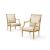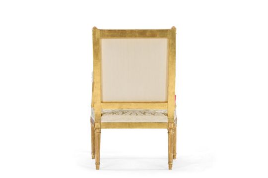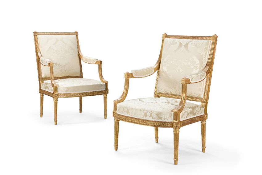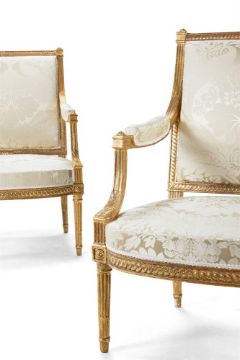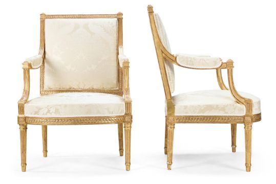 ‡ A PAIR OF LOUIS XVI GILTWOOD FAUTEUILS A LA REINE ATTRIBUTED TO GEORGES JACOB, CIRCA 1780 Upholstered in pale yellow silk damask, with a guilloche-carved back and part-padded arms with squared terminals and downcurved foliate supports, the bowed padded seat with guilloche rails and tapering turned fluted legs headed by rosette blocks, pegged construction 100cm high, 69cm wide, 72cm deep  Provenance: Acquired from Mackinnon, London by the present owner  Georges Jacob was among the most important of the menusiers active in Paris in the last decades of the Ancien Régime, and along with Jean-Baptiste Claude Sené was the principal supplier of seat furniture and console tables to the French court. He sometimes identified his work by way of a stamp I. JACOB though the seats offered here do not appear to bear any such mark. The attribution is therefore based on stylistic characteristics, including the guilloche-carved frames, the leaf carving that runs up the curved arm support, and the fluted block at the base of the arm support, all of which feature on chairs bearing Jacob's stamp (see Sotheby's, Paris, 4 June 2020, lot 134, a set of four sold 11.250EUR including premium, and Sotheby's, New York, 16 October 2024, lot 138, a set of four sold $14,400 including premium). Condition Report: Good, structurally secure with dents marks and scratches and shrinkage cracks due to age and use. Re-gilt with flaking and minor losses. Both chairs formerly but not originally with screwed corner blocks, now removed. The upholstery is clean and the webbing tight. Overall in good clean condition and fit for use. Condition Report Disclaimer
