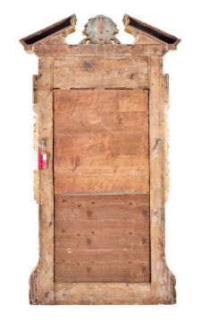 ‡ A GEORGE II CARVED GILTWOOD MIRROR IN THE MANNER OF WILLIAM KENT, AFTER A DESIGN BY WILLIAM JONES, CIRCA 1740 The broken foliate and egg-and-dart pediment centred by a shell above a frieze with a draped female mask , the rectangular plate within a sanded surround with ribbon and rosette and shell carved borders, the sides hung with leaf and berry swags and with a Vitruvian scroll panel below, chalked 7737-52 216cm high, 120cm wide The mirror is designed in the Palladian style introduced by Lord Burlington and popularised by architect/designer William Kent (d.1748). Despite Kent's fame through furniture commissions for houses including Houghton, Holkham and Raynham in Norfolk, and Lord Burlington's own villa Chiswick House, few of his drawings or engravings survive, though some were published by John Vardy in Some Designs of Mr. Inigo Jones and Mr. William Kent, 1744. A design for a mirror by Kent from Chatsworth House, Derbyshire that includes features of the mirror offered here including the prominent shell cresting is illustrated in Margaret Jourdain, The Work of William Kent, London, 1948, p. 172, fig. 136. The design relates most closely to patterns published in 1739 by William Jones in The Gentleman or Builder's Companion, containing Variety of useful Designs for Doors, Gateways, Peers, Pavilions, Temples, Chimney-pieces etc.... described subsequently as `the earliest published group of furniture designs by an English designer' (S. Jervis, The Dictionary of Design and Designers, London, 1984). Plate 48 of Jones's Companion illustrates a mirror with a similar broken pediment above a foliate entablature centred by a classical mask. A white-painted pier mirror of similar form was sold from the collection of Jasper Conran, Christie's, London, 14 September 2021, lot 47 (£75,000 including premium).   Condition Report: Good, structurally secure, with minor dents marks and scratches and shrinkage cracks due to age and use. Re-gilt and the glass probably replaced in the 19th century, with minor foxing around the edges. The backs of the side swags are a bit cleaned off and they may actually be replaced. There are multiple old drilled hanging holes to the backboards indicative of good age. The gilding with minor wear and small chips to extremities. Overall in good condition and ready to hang. Condition Report Disclaimer