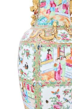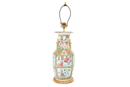 A CANTON ENAMELLED VASE CHINESE, 19TH CENTURY Decorated throughout with courtly scenes amidst borders of flowers and foliage, with stylised dragons and dogs of Fo to the necks, now mounted as lamps, with hand-gilded turned bases the vase 46cm high Provenance: Acquired from Mackinnon, London by the present owner Please note, this lamp is not sold with a lampshade. Condition Report: Wear to the gilding and the enamel. Unexamined under the fitment. Fitted for electricity and with an in date 2025 PAT test.Condition Report Disclaimer