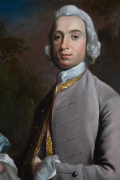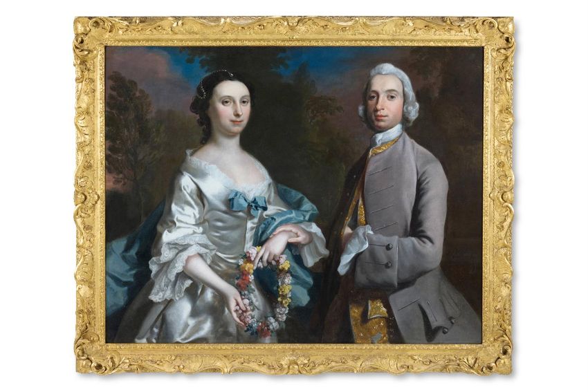 ‡ JOSEPH HIGHMORE (BRITISH 1692-1780) DOUBLE PORTRAIT OF MR EDWARD PRYCE (B.1723) OF GUNLEY AND MRS FRANCES PRYCE, NEE EGERTON OF TRELYDAN, HALF LENGTH, WITH A LANDSCAPE BEYOND Oil on canvas Signed and dated Jos Highmore/pinx 1752 (lower right, on a ledge) and with inscription, Mr + Mrs Edward Pryce/she was Miss Egerton of Trelydan (on a label attached to the stretcher) and with a further inscription Mr & Mrs Edwd Pryce/of Trelydan (on a label attached to the frame) 102 x 127cm (40 x 50 in.)Provenance: The Pryce family (records indicate a receipt for the painting and frame on 7 May 1752). Anonymous sale; Woolley & Wallis, Salisbury, 4 April 2007, lot 359. Acquired from Butchoff Antiques, London by the present owner. The Pryce family were seated at Gunley (Gwnle) manor in Chirbury, Shropshire from ancient times. Edward Pryce married Frances, daughter and co-heiress of Rev. James Egerton, of Trelydan, in 1751. The present work was probably commissioned on the occasion of their marriage. Joseph Highmore was encouraged by his family to train as a lawyer and took a clerkship at the age of 17, while still attending Godfrey Kneller's Drawing Academy. By 1715 Highmore abandoned his law career, and began work as a portrait painter in London. From 1720 he attended the St. Martin's Lane Academy, where he was able to study contemporary French styles in art and design, particularly that of Gravelot. He also attended William Cheselden's anatomy lectures and contributed designs to that author's Anatomy of the Human Body, 1722. Highmore travelled to the Low Countries to study works by Rubens and van Dyck, and later went to Paris, where he saw the art collections at Versailles, the Palais du Luxembourg and the Louvre. In the following years he secured important commissions from the Royal family, such as Queen Caroline of Ansbach (circa 1735; Royal Collection, Hampton Court).