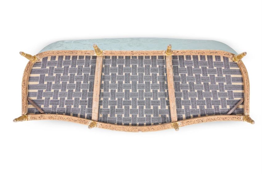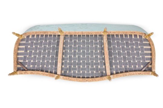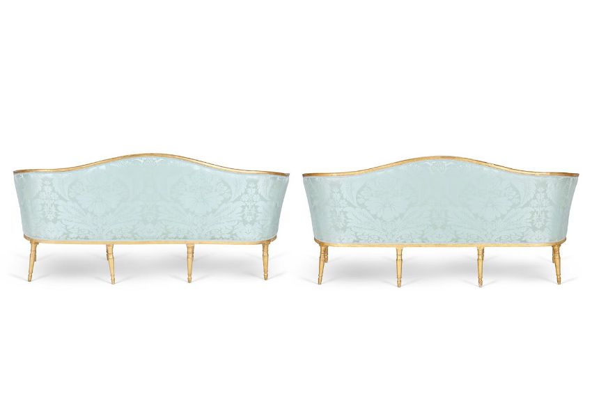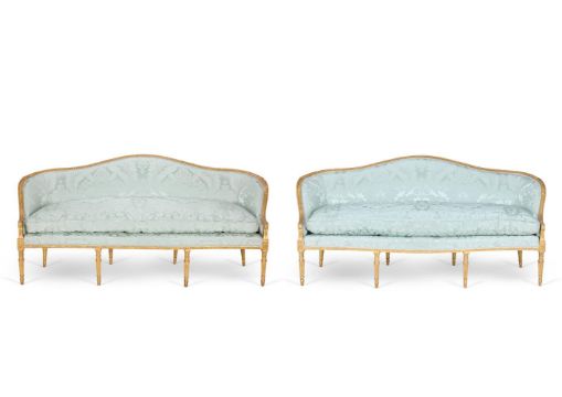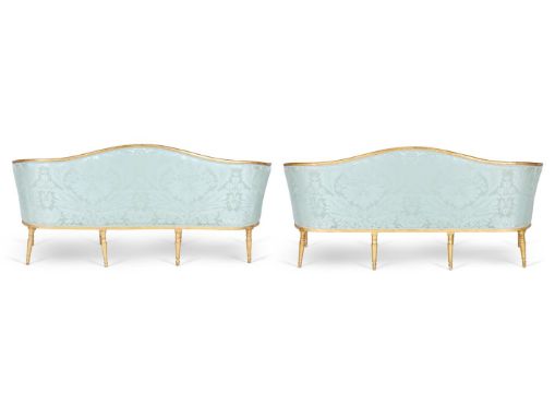‡ A PAIR OF GEORGE III GILTWOOD SETTEES CIRCA 1785 Upholstered in pale blue silk damask, each with a waterleaf, beaded and foliate frame with scrolled arms and loose cushion, on tapering turned and fluted legs 95cm high, 203cm wide, 85cm deep Provenance: With Mallett, London, illustrated in their 2014 catalogue (pp. 166 - 169) Acquired from Mackinnon, London, by the present owner. Although it's not possible to attribute these sofas with any certainty, their design and quality infer that they must have been made by one of the more prestigious chair-makers active in the last quarter of the 18th century. Certain features suggest they might be the work of Messrs. Ince and Mayhew of Soho, London, notably the leaf-carved plinth upon which the arm support rests which featured in giltwood chairs supplied by the firm in 1786 to William Pierce Ashe à Court and in 1795 to Thomas Allen while a set of painted chairs supplied in 1782 to the Dowager Duchess of Beaufort featured a leaf-carved collar at the top of the leg (though not the double collar as in the present lot (see H. Roberts and C. Cator, Industry and Ingenuity The Partnership of William Ince and John Mayhew, London, 2022, p. 365, figs. 329 and 331, and p. 364, fig. 325). Gillows, the prolific Lancaster furniture makers also supplied seat furniture featuring the same leaf-carved plinth, as displayed on chairs sold anonymously Christie's, New York, 22 April 1999, lot 76, one chair of which bore the pencil inscription R.Gillow.   Condition Report: Good, structurally secure, with dents marks and scratches and shrinkage cracks due to age and use. Re-gilt. There are minor chips and losses to the gilding. Some minor old (inactive) worm to the seat frames. The upholstery clean and the webbing tight. The cushions well stuffed. The seat was previously sprung from the evidence of the nailing on the underside of the seat rails. One sofa repairs and possible replacement to the back legs. Overall a good pair of sofas in ready-to-use condition. Condition Report Disclaimer