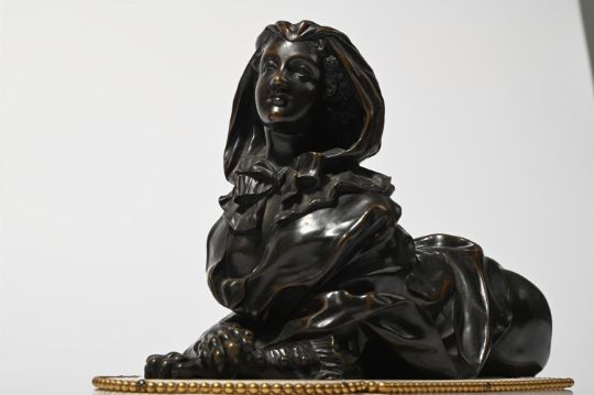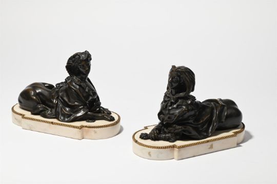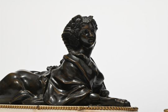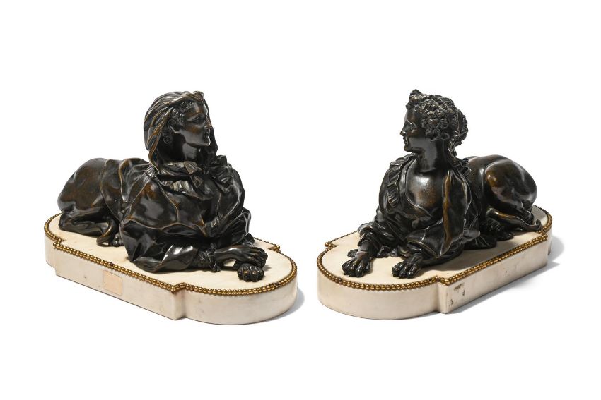 A PAIR OF BRONZE SPHINXES ON MARBLE BASES