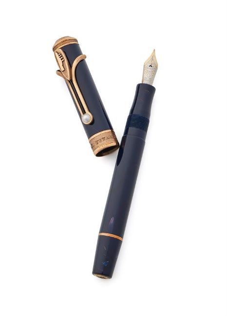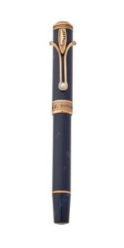 VISCONTI, TITANIC A LIMITED EDITION FOUNTAIN PEN, NO. 006/100 Cap and Barrel: Blue cap and barrel, the cap with a pearl set gilt metal clip chased with the Titanic Nib and Filling System: Medium two tone gold coloured nib stamped 18k 750, piston filling system, uninked Accessories: Visconti box, identity card, booklet, inkwell and outer card packaging   Condition Report: Like new condition Condition Report Disclaimer