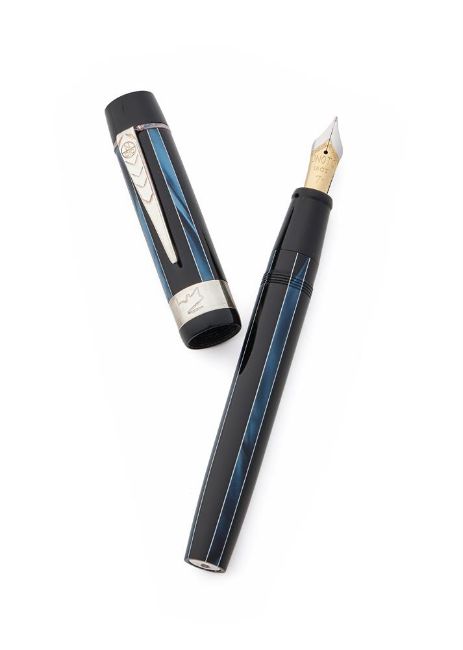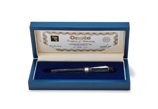 ONOTO, THE WINSTON CHURCHILLPEN A LIMITED EDITION FOUNTAIN PEN, NO. 8/200, 2011 Cap and Barrel: Blue resin cap and barrel, the cap with a white metal clip and silver cap band, hallmarked Birmingham 2011 Nib and Filling System: Two tone gold coloured nib stamped 18CT, cartridge filling system, cartridge convertor, uninked Accessories: Onto box, certificate of authenticity, booklets, polishing cloth and outer card packaging Condition Report: Pen like new conditionTop of box comes out looseCondition Report Disclaimer
