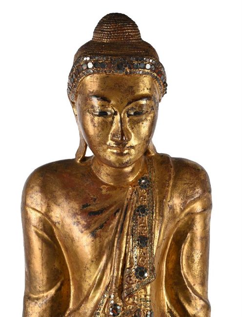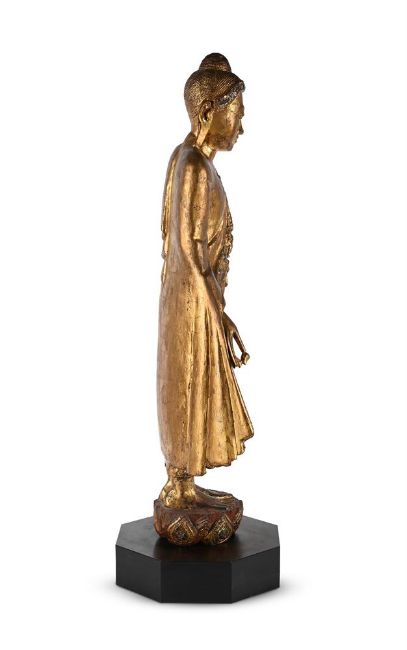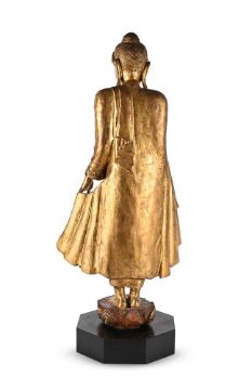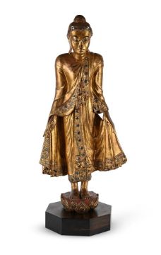 A Burmese gilded and lacquered wood figure of Buddha, 20th century, standing on a lotus, his hands holding the fold of robes, with glass inlay, the figure 88cm high, wood stand
