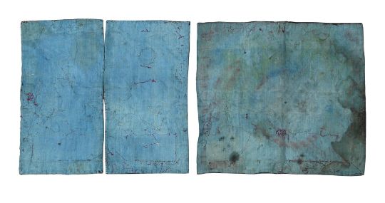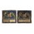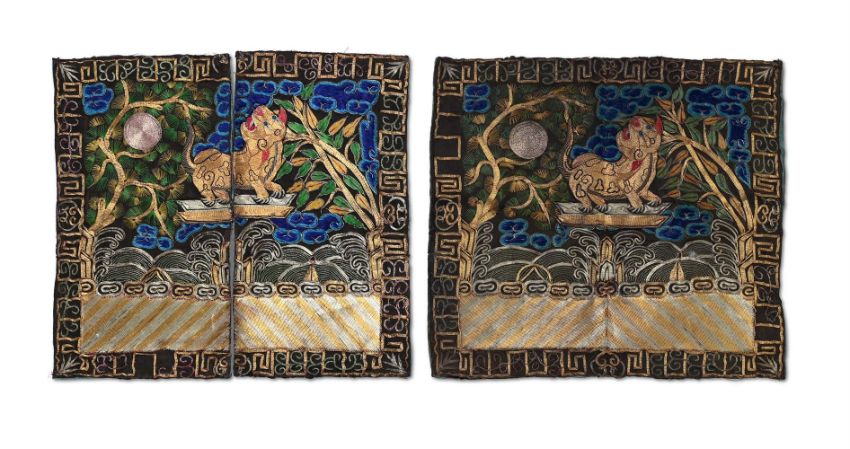 † A pair of Chinese rank badges depicting a leopard for a 3rd rank military officer, circa 1900, boldly worked in gold and silver thread with green pine and bamboo trees either side of the rocky outcrop, 27cm high x 29cm wide (2)  晚清民國 三品武官補子一對   Condition Report: some loose and or missing gold and silver wire mainly to borders and some later stitching holding wires in place and staining to blue silk on reverse sides Condition Report Disclaimer