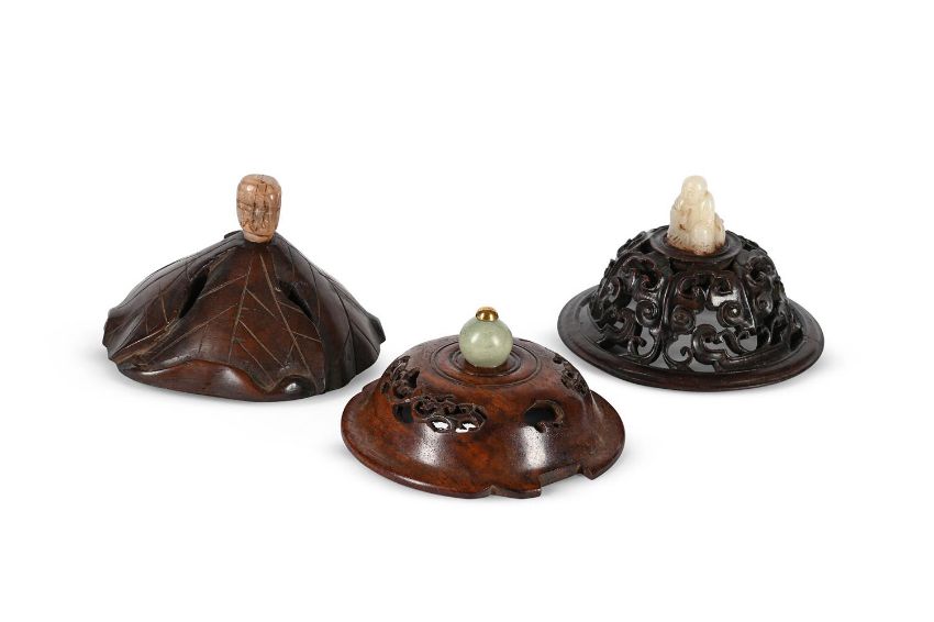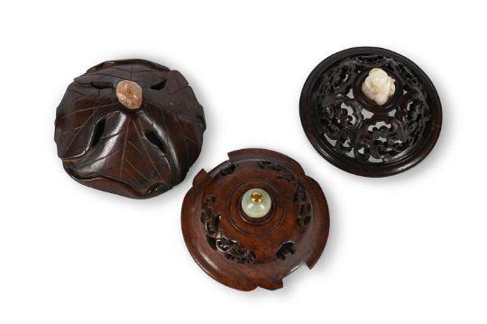 Three Chinese carved hardwood covers, Qing, all with hardstone finials, 11cm wide and smaller (3)清 玉鈕木蓋等三件 Condition Report: the pierced cover on the far right of the image with riveted repair to secure a crack on the rim otherwise they are all in good condition other typical wear Condition Report Disclaimer