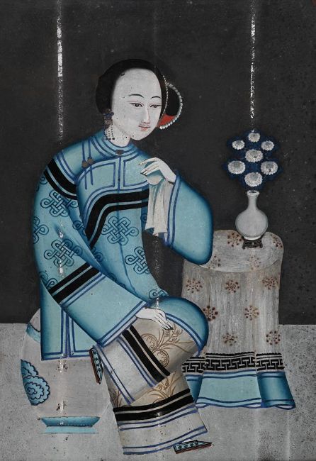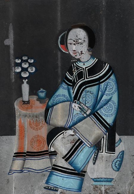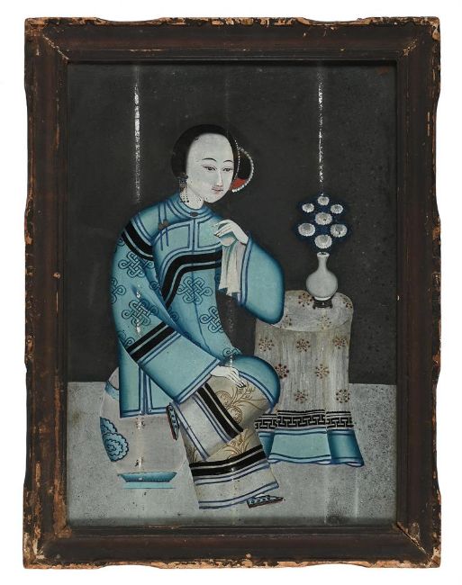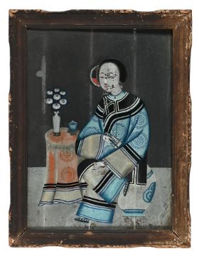 A pair of Chinese reverse glass paintings of ladies, 19th century, seated facing to the left and right, 50cm x 35cm, frame (2) 晚清 外銷玻璃畫仕女圖一對 Condition Report: some paint loss and silvering to plates and framed in poor condition Condition Report Disclaimer