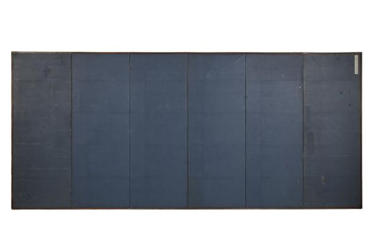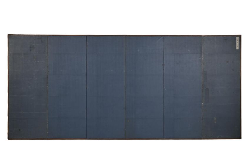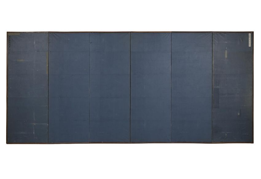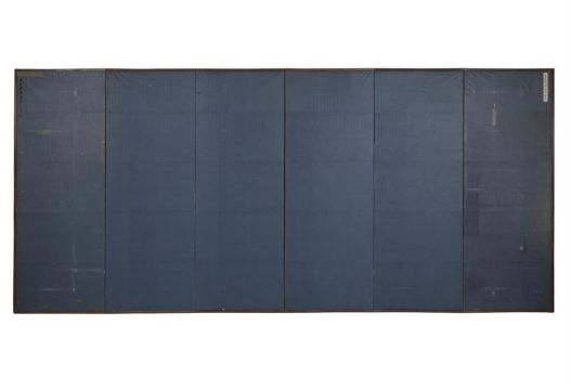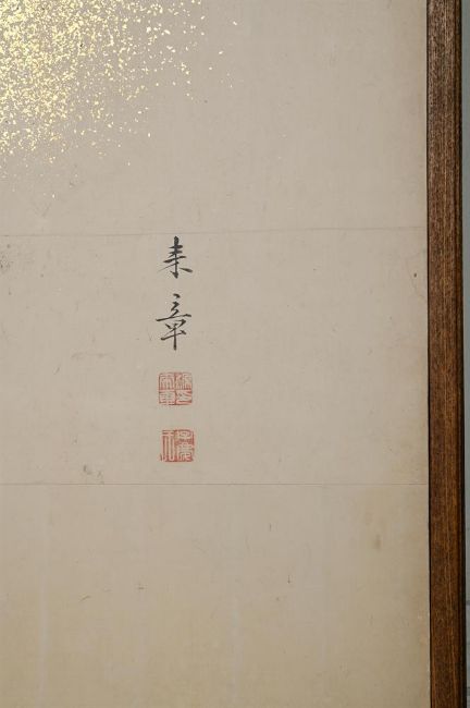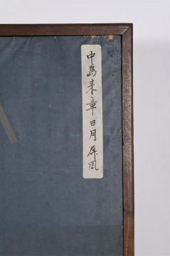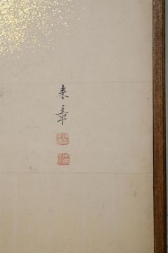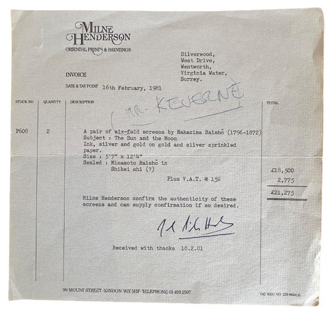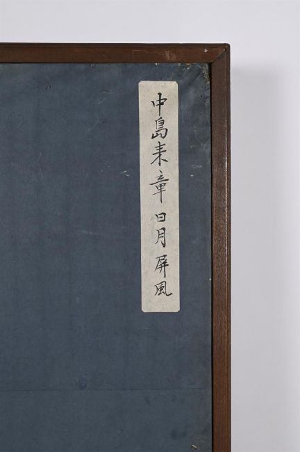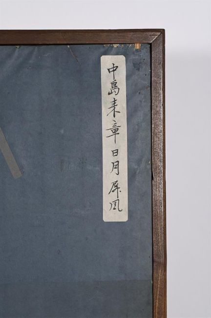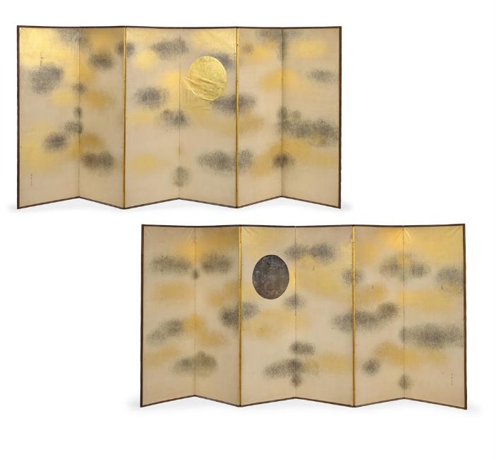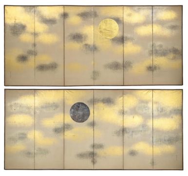 A large and attractive pair of Japanese six-fold Byobu, by Nakajima Raisho, (1796-1872), depicting the Sun and the Moon, ink, silver and gold on gold and silver sprinkled paper, both signed and with seals, each approximately 170cm high x 377cm wide (2) Provenance: The Property of a Lady Milne Henderson Gallery, London, 16th February 1981 and sold with a copy of the purchase receipt (£21,275). Condition Report: overall in very presentable condition but with some tears to paper including a long tear to paper under the sun extending to edge of panel and further tears mainly to top and bottom edges and some midway edges please ask for additional images for a visual reference to condition Condition Report Disclaimer