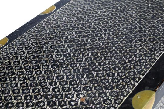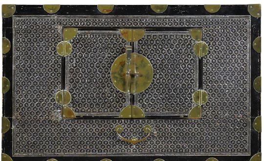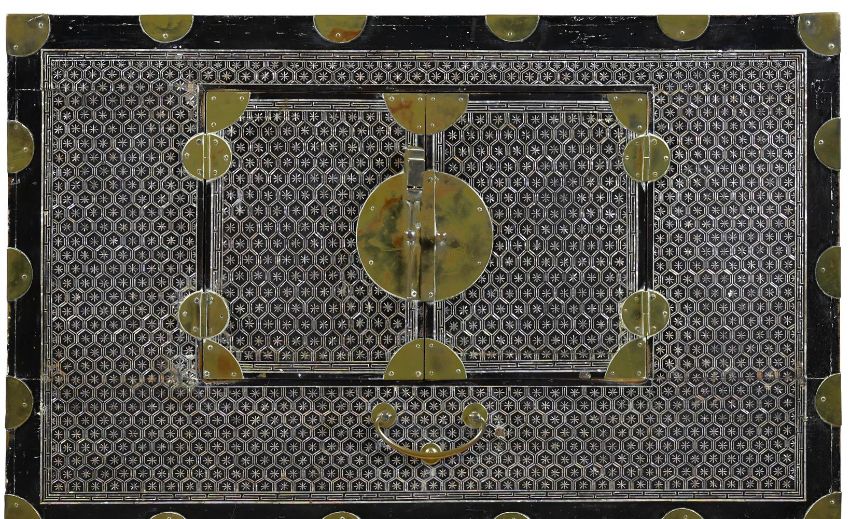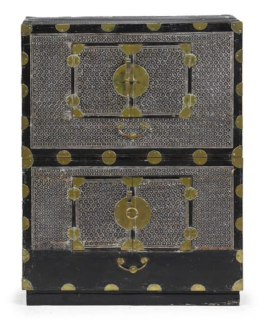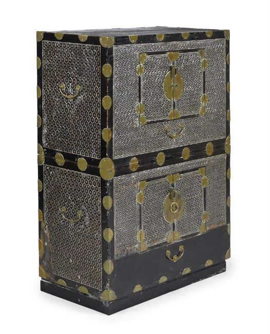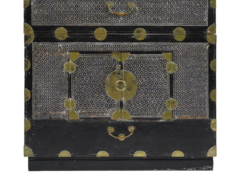 Y A Korean mother-of-pearl lacquer cabinet, Joseon dynasty, 19th or 20th century, consisting of two rectangular chests, one on top of the other, the chest opens with two doors on the front, adorned with geometric mother-of-pearl inlay and punctuated with gilt metal circular-shaped hardware around the doors and edges, 108cm high (including 6cm later ebonised base) x 80.5cm x 39.5cm, each trunk is 51cm high Compare with a related lacquer cabinet sold Christies, Paris, Art D'Asie, 10th December 2020, lot 124   Condition Report: some old damage and repairs and other knocks and dents to metalwork please see additional images for a visual reference to condition Condition Report Disclaimer