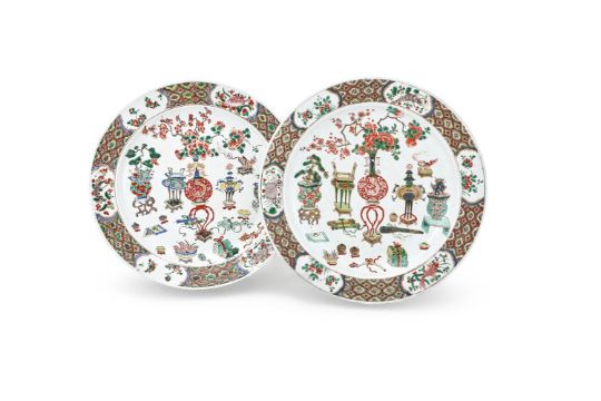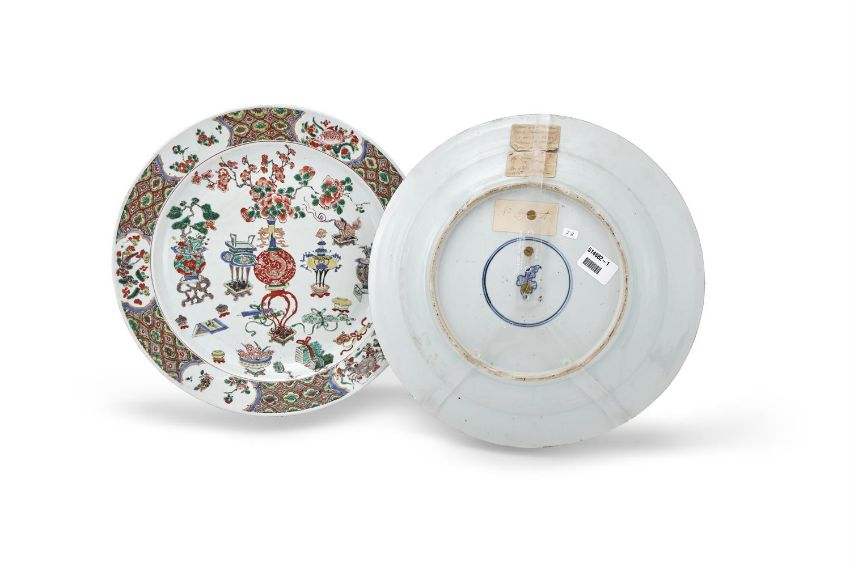A large pair of Chinese Famille Verte dishes, Kangxi (1662-1722), painted with a central ovoid vase with slender neck issuing peonies and flanked on each side with censers and jardinières above symbolic Buddhistic 'precious objects', the borders reserved with cartouches of fish, various crustaceans and flowers, 36cm diameter (2) Provenance: The property of a Lady Arts et Decors, Zurich, 23rd October 1989 清康熙 五彩博古圖大盤一對拍品來源:歐洲女士私人珍藏,1989年10月23日購自蘇黎世 Condition Report: one dish with triangular enamel chip to the green neck of vase approximately 5mm x 5mm and both with rim frits and some minor wear ad scratches Condition Report Disclaimer