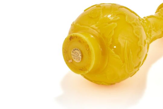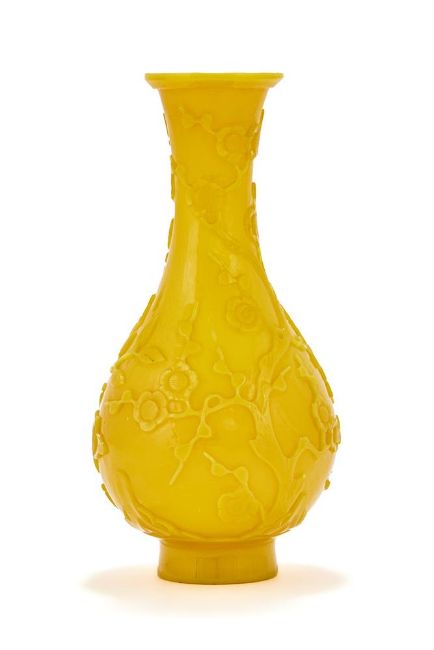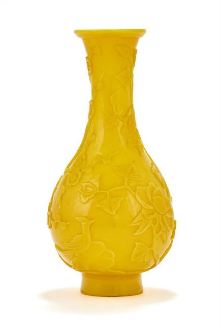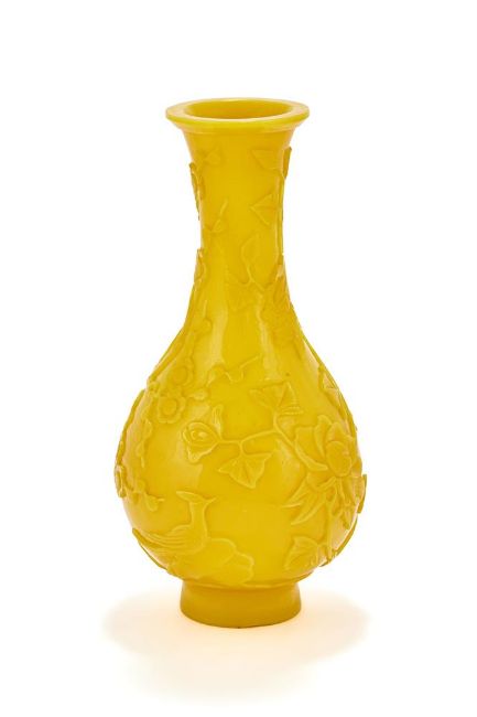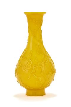 A Chinese Peking yellow glass bottle vase, 18th or 19th century, crisply carved in low relief with a bird perched on a rock and prunus and peony tress growing among rocks, the flowering branches extending up the tall neck, stopping below the slightly flared lipped rim, all raised on a gently splayed foot, 22.8cm high Provenance: Christies, Fine Chinese & Export Ceramics & Works of Art, sale 6384, 15th November, 2000, lot 123 (£3500) 清十八/十九世紀 黃料花鳥紋瓶拍品來源:現藏家於2000年11月15日以3500英鎊購自倫敦佳士得,拍品123號 Condition Report: minor nicks to extremities Condition Report Disclaimer