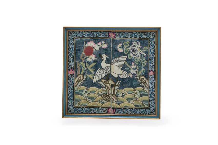 † A Chinese front rank badge, circa 1890-1900, the fifth rank silver pheasant is applied to the ground and looking at the applied red sun, embroidered in classic counted stitch on a summer gauze silk, the border is embroidered with running dragon pattern chasing pearls of wisdom with pink flames, 22cm x 23.5cm, framed 晚清 納紗五品文官補子 Condition Report: unexamined out of frame but colours look fresh and condition goodCondition Report Disclaimer