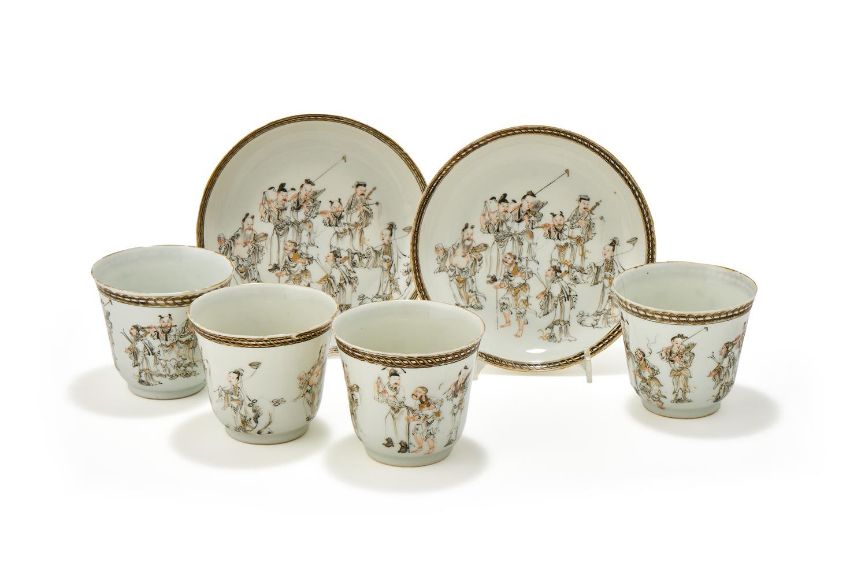 A pair of Chinese en grisaille and gilt 'Eight Immortals' saucers and four matching cups, 18th century, the saucer 14.4cm diameter and the cup 7cm high (6)清十八世紀 釩紅墨彩描金八仙人物圖鈴鐺杯及碟等一組六件 Condition Report: all cups with minute chips to the rim and one cup with three cracksone saucer with a star crack to the baseCondition Report Disclaimer