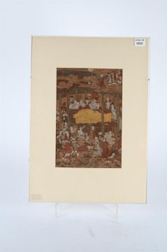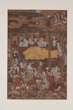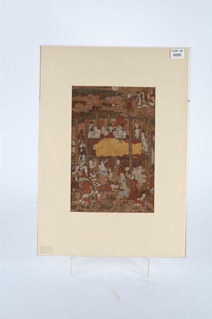 Anonymous (18/19th century), Japanese, Parinirvana (Death of the historical Buddha), ink, colour and gold on paper, 35cm x 23cm to edge of mount, framed Provenance:A Private Country House CollectionPlease note this lot is to be sold without reserve. Condition Report: unexamined out of frame but some holes to paper and small areas of paint loss can be seen under the glazing Condition Report Disclaimer