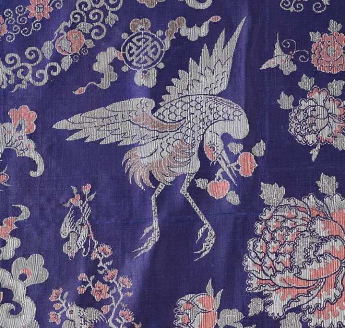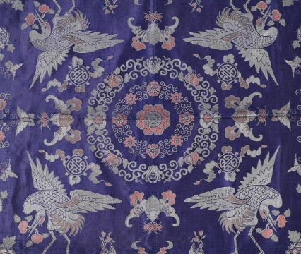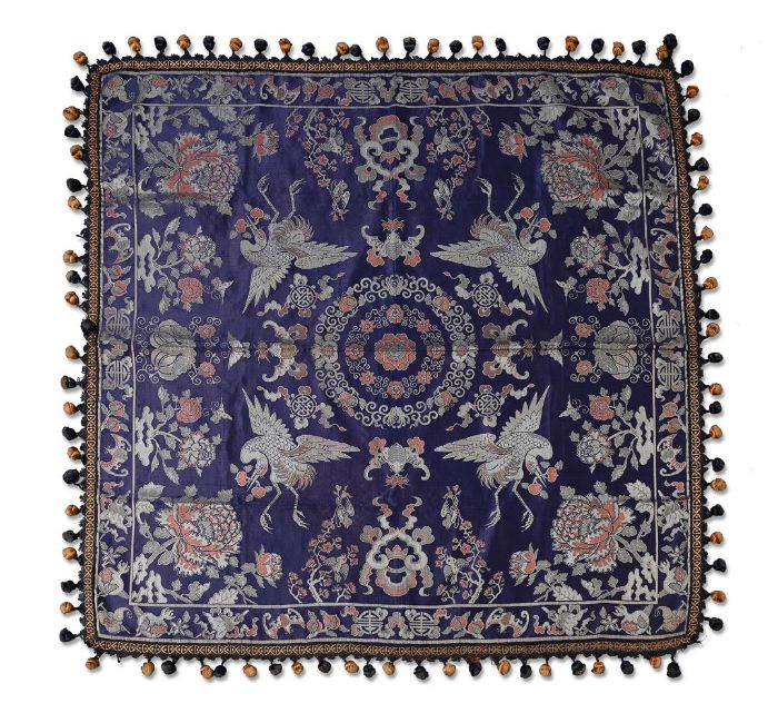 A Chinese jacquard weave brocade panel, circa 1900, woven in coral and white on a mauve ground, with four large cranes carrying peaches both symbols of long life, the border depicts bats further long life and happiness symbols, a latter edge with a European tasselled ribbon has been added, 95cm square  The introduction of jacquard looms from France resulted in the production of decorative panels made to adorn tables, seats and possibly gift coverings. 晚清民國 仙鶴團花紋屏 Condition Report: in good condition other than some wear to tassels and some lost and some wear to silk on fold lines Condition Report Disclaimer