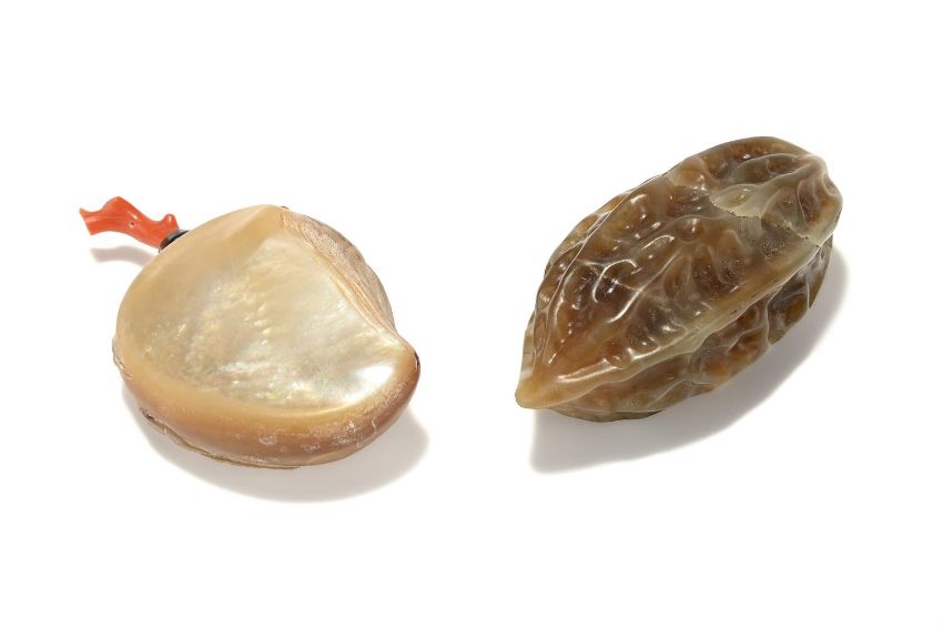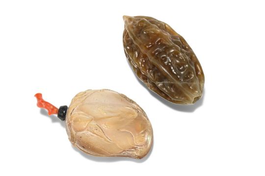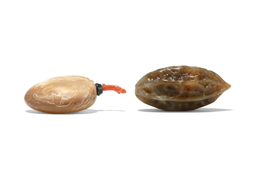 Y A Chinese carved mother-of-pearl 'Longevity' snuff bottle, Qing Dynasty, carved with a bat clambering on the fruit, 6cm long including the coral stopper; and a Chinese russet mottled jade 'Walnut' snuff bottle, 19th century, 6cm long (2)Provenance:Private collectionPlease note this lot is sold without reserve. 清 螺鈿福壽圖鼻煙壺及玉核桃形鼻煙壺兩件拍品來源:英國私人收藏* 請注意本拍品不設底價 Condition Report: natural flaws to the mother of pearl snuff bottle and stopper with a spoon and the walnut snuff bottle with cracks possible having been in half Condition Report Disclaimer