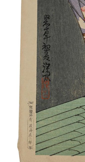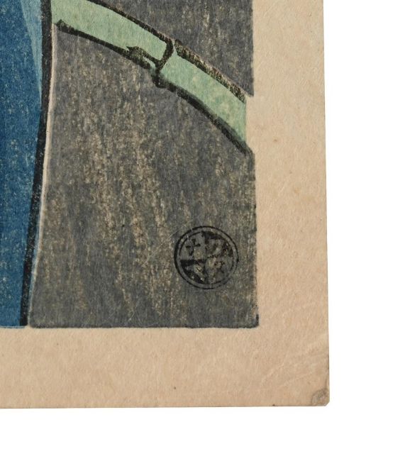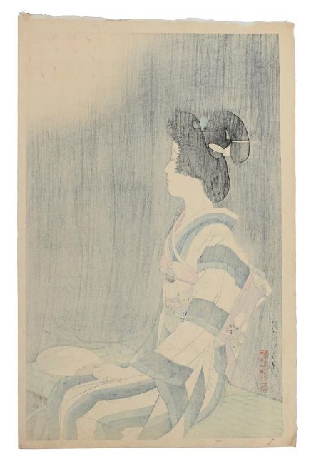 ‡ The Property of a Lady Ito Shinsui (1898-1972) Fireworks (Hanabi) Showa period, 20th century woodblock print, from the series Second Series of Modern Beauties (Gendai bijin, dai-nishu), signed and sealed Shinsui, publisher's mark (Hotei 'D', circa 1929-42) Hanken shoyu Watanabe Shozaburo [copyright reserved, Watanabe Shozaburo], and publisher's circular seal Watanabe, the reverse with hand-numbered red limited edition seal nihyaku goju mai zeppan dai hyakuhachiju ban [limited edition of 180 out of 250], publisher's rectangular mark Watanabe to verso, dated Showa shichinen shoka (early summer, 1932)Vertical dai oban: 43.4 x 27.8 cm. An elegant young woman sits on a bamboo bench gazing at a summer firework display. She wears a summer kimono of striped blue and white interspersed with bands of hanabishi. Her obi sash is embroidered with stylised morning glories and ivy. On her lap rests a fan decorated with swirling waters. A similar impression of the same print is in the collection of the Minneapolis Institute of Art, accession number 2002.161.74, go to: Condition Report: Good impression and colour, minor toning, some light creasing to margins, a few very minor fox marks. Condition Report Disclaimer