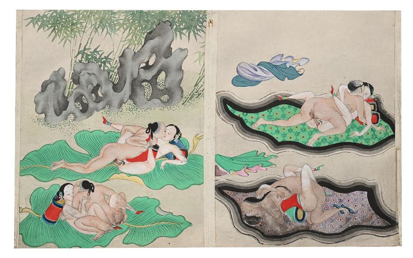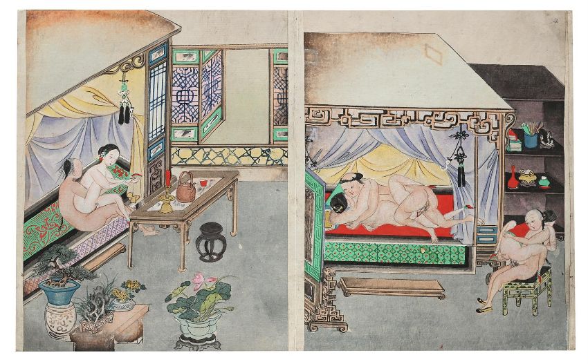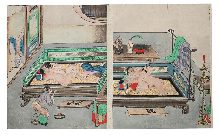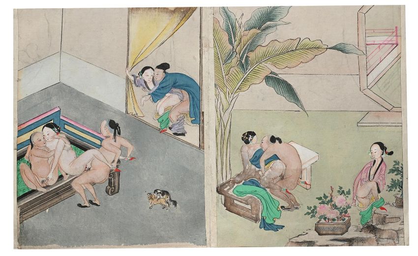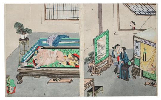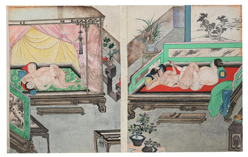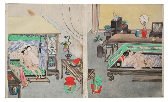 A Chinese album of fourteen erotic paintings, late Qing Dynasty, mounted as a fourteen-leaf album with covers, comprising fourteen colour paintings on paper, each depicting figures engaged in amorous pursuits, some of an explicit nature, on terraces and in interiors, each painting size 25cm x 19cm Provenance: From a private collection 晚清 春宮畫冊一本共十四幅 設色紙本 Condition Report: fading and water damagesCondition Report Disclaimer