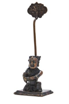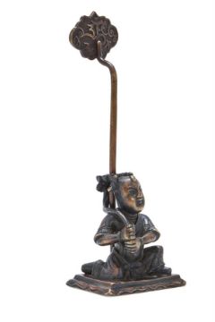 A Chinese bronze 'Boy' candle holder, the stand shaped as a kneeling body, 24.5cm in total, weight 884.5 grams銅童子燭臺 Condition Report: general wear and rubbing to the surfaceCondition Report Disclaimer