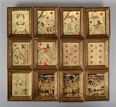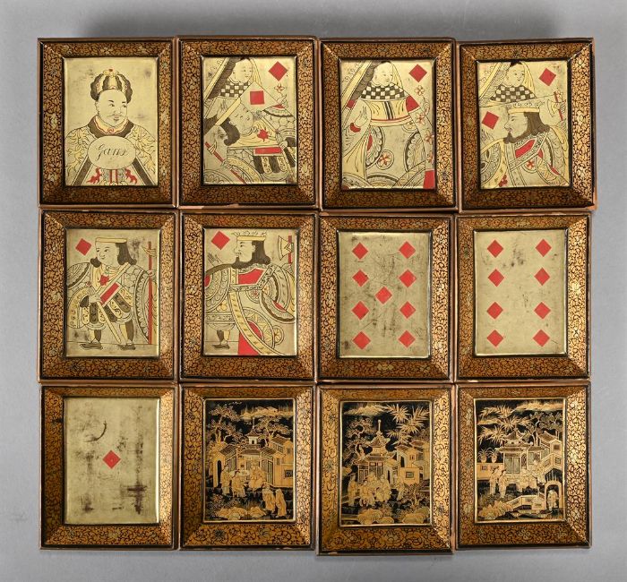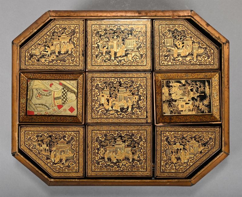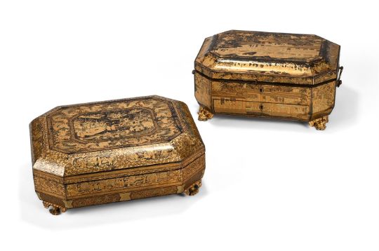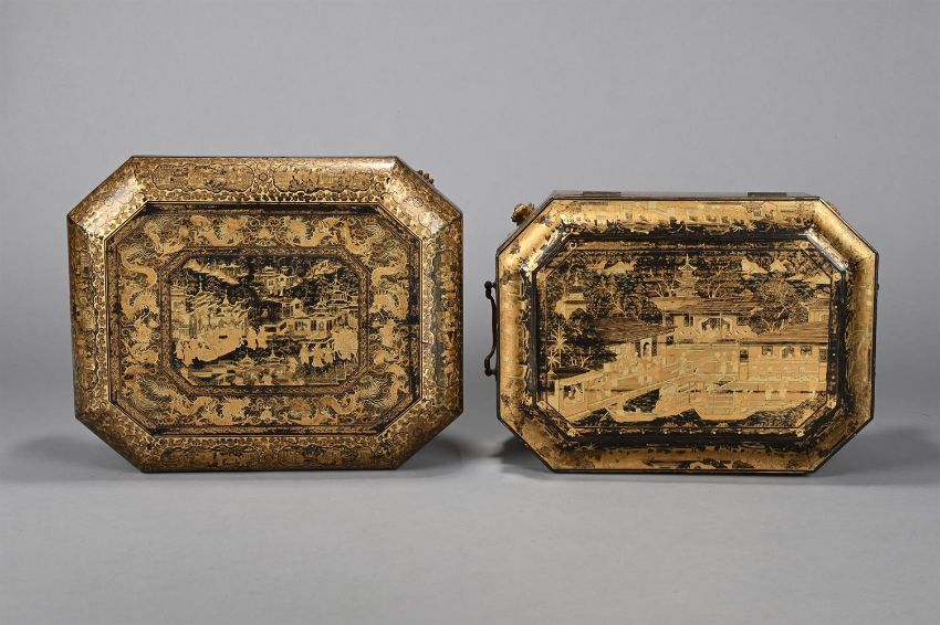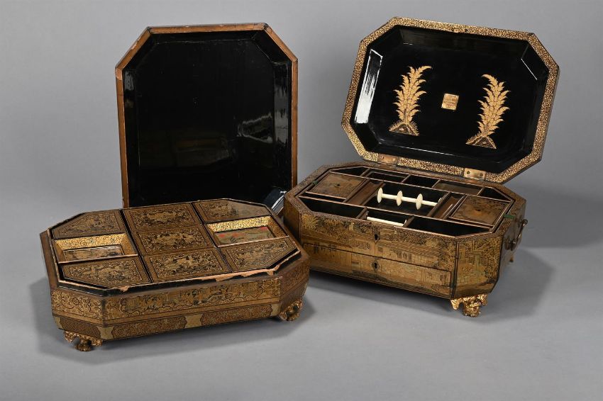 Y  A Chinese Cantonese lacquer game box, 19th century, with twelve trays and boxes inside, 38cm long x 13.5cm high; A Chinese Cantonese lacquer sewing box, circa 1873, 36cm long x 18cm high (2)Please note, Dreweatts have applied for a de minimis exemption certificate for the ivory in this lot (Ref: 38NKEKYL)清十九世紀 廣東外銷黑漆描金針線盒及棋牌盒兩件 Condition Report: wear to gilding on both and some chips Please note, Dreweatts have applied for a de minimis exemption certificate for the ivory in this lot (Ref: 38NKEKYL)      Condition Report Disclaimer