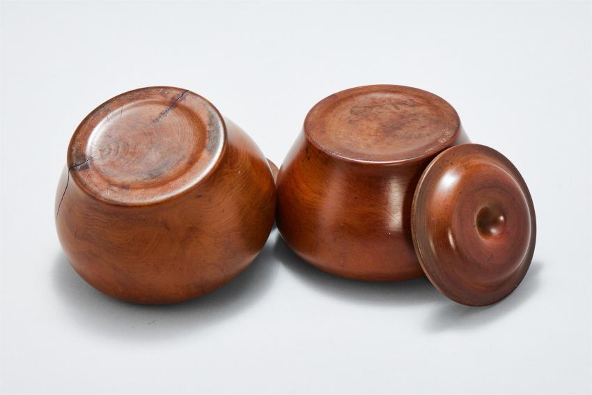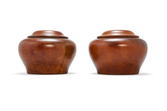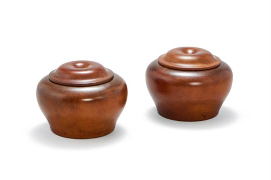 A pair of Chinese Boxwood Weiqi Boxes and Covers, Qing Dynasty or later, of compressed globular form, with rounded lids carved with dimpled centres, 9cm high (2)Provenance: By repute formerly from a Private Yorkshire Collection. Please note this lot is to be sold without reserve.清或晚 黃楊木圍棋盒一對拍品來源:英國約克郡私人收藏*請注意本品不設底價 Condition Report: cracksCondition Report Disclaimer