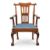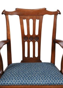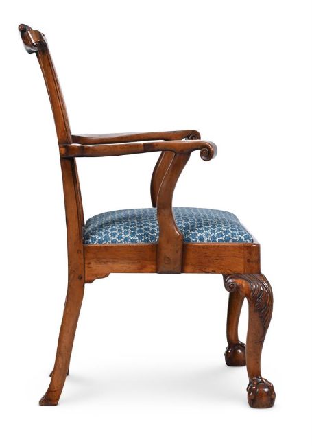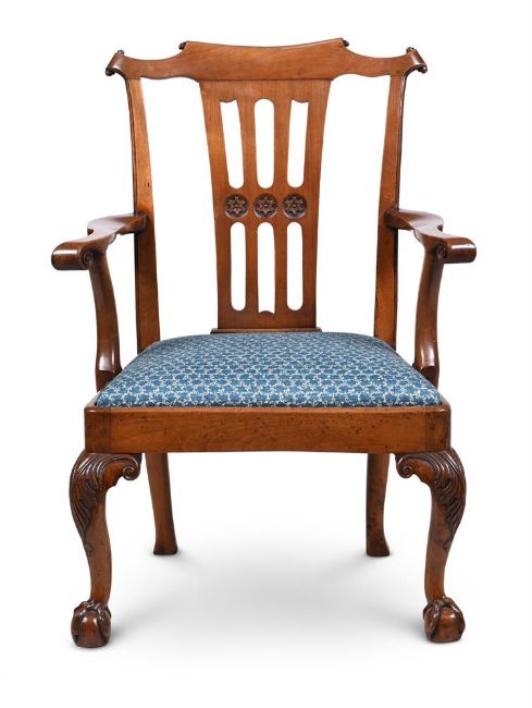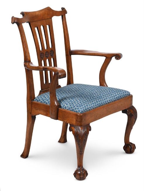 A GEORGE II FRUITWOOD OPEN ARMCHAIR CIRCA 1750 With a pierced splat, scrolled arms and acanthus-carved cabriole legs 97cm high, 73cm wide, 58cm deep Condition Report: Marks, knocks, scratches and abrasions commensurate with age and use. Some old splits and chips. Some old, glued repairs.The front right foot with a neat old spliced repair, see images The upholstery in good, clean condition. Some colour variation and fading as to be expected Some evidence of old worm.Of overall pleasing colour and carving, and solid and stable overall.From the floor to highest point on the seat - 45cm high Please see all additional images as a visual reference to this report Condition Report Disclaimer